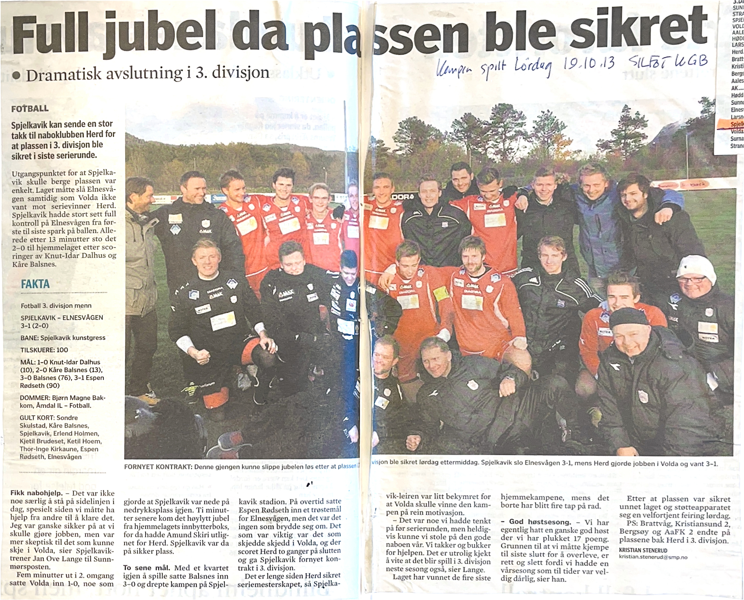 "Spjelkavik kan sende en stor takk til naboklubben Herd for at plassen i 3. divisjon ble sikret i siste serierunde. Utgangspunktet for at Spjelkavik skulle berge plassen var enkelt. Laget måtte slå Elnesvågen samtidig som Volda ikke vant mot serievinner Herd. Spjelkavik Hadde stort sett full kontroll på Elnesvågen fra første til soste spark på ballen. Allerede etter 13 minutter sto det 2-0 til hjemmelaget etter scoringer av Knut-Idar Dalhus og Kåre Balsnes."