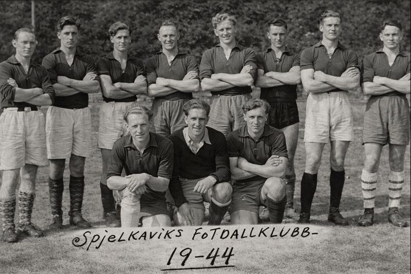 A-laget. Svein Foss i Spjelkavik har sendt oss et historisk fotografi som han knytter følgende ord til: - Det tynnes ut i rekkene blant de gamle gode spjelkavikere. De staute karene på bildet har på ulikt vis satt sitt preg på vikamiljøet. De deltok aktivt i samfunns-, kultur- og idrettsliv og var med på å forme bygda Spjelkavik og gi miljøet en identitet. De fleste er nå borte. Hedersmannen, humørsprederen og vikapatrioten, kjøpmann Per Myrstad, gikk bort nå i januar. Bildet er fra en "illegal" fotballkamp i Ørsta i 1944, ifølge Peder Nedregaard.