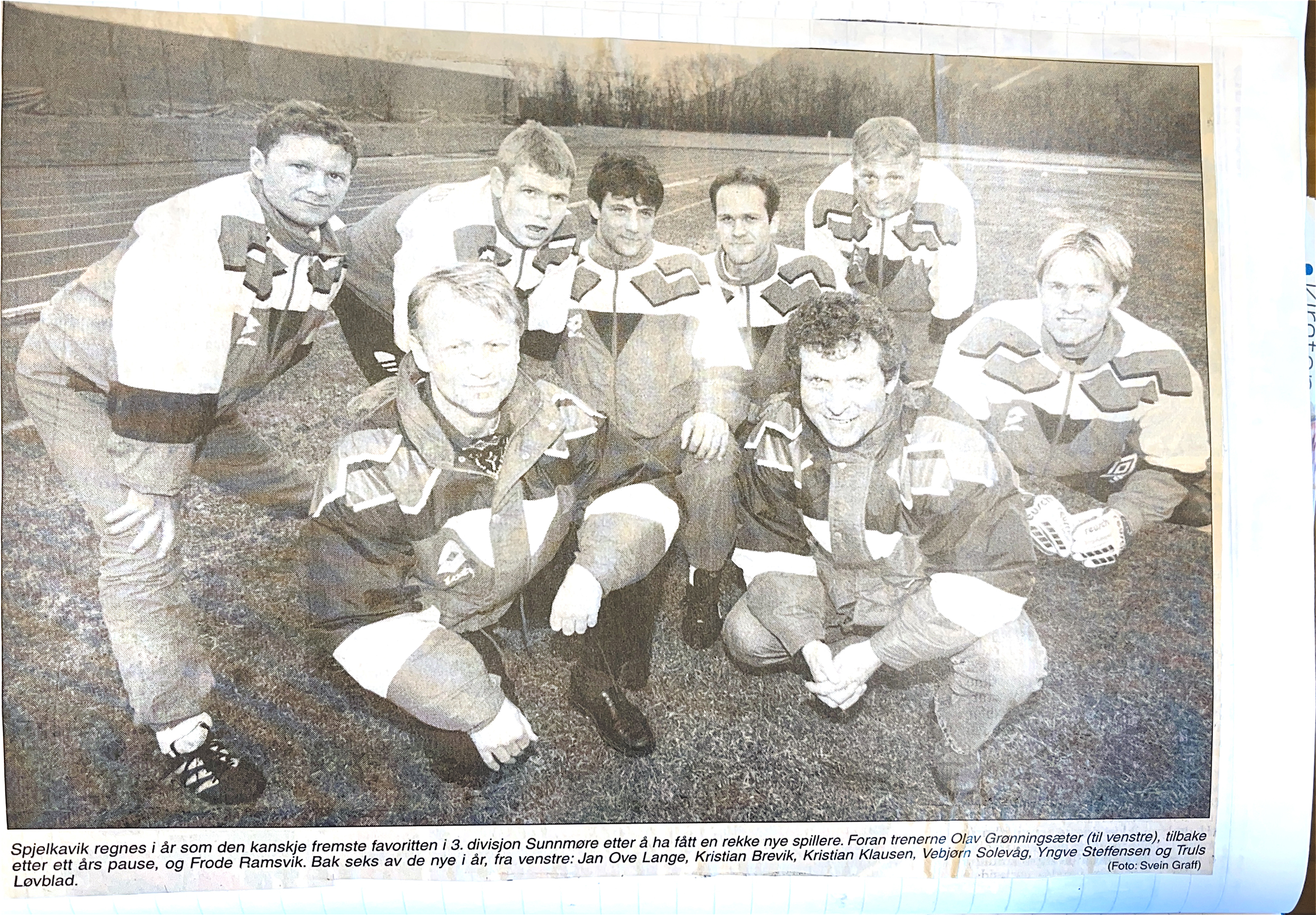 Spjelkavik regnes i år som den kanskje fremste favoritten i 3. divisjon Sunnmøre etter å ha fått en rekke nye spillere. Foran trenerne (til venstre) Olav Grønningsæter tilbake etter et års pause, og Frode Ramsvik. Bak seks av de nye i år, fra venstre: Jan Ove Lange, Kristian Brevik, Kristian Klausen, Vebjørn Solevåg, Yngve Steffensen og Truls Løvblad.